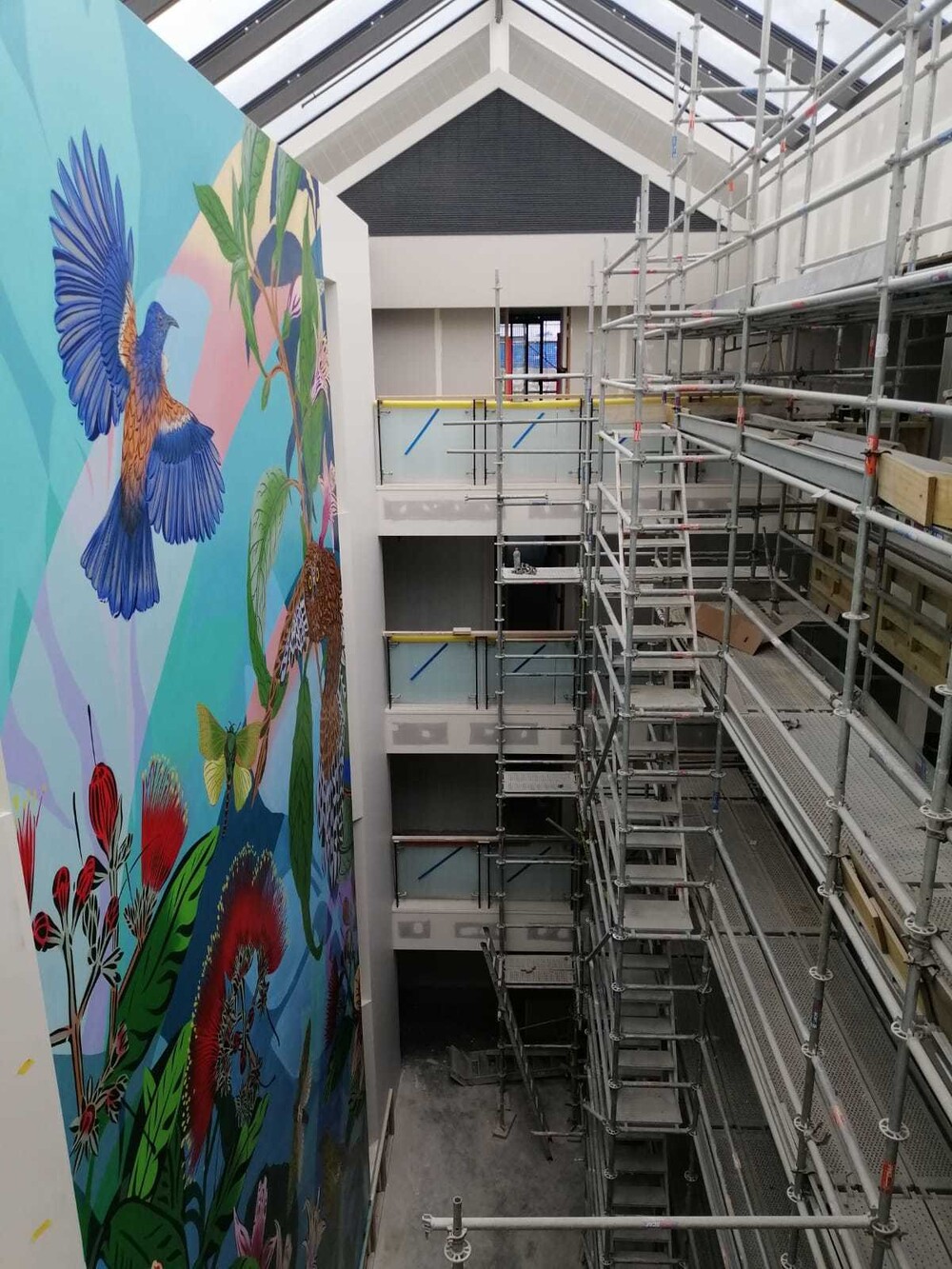 Flox collaborated with artist Ross Liew (TrustMe) taping, spraying and hand painting in the various colours and details. Within quite a tight timeframe, the Pōhutukawa and Kotukutuku bloomed and the Ruru and Tui took flight on the biggest interior mural they’ve created.
