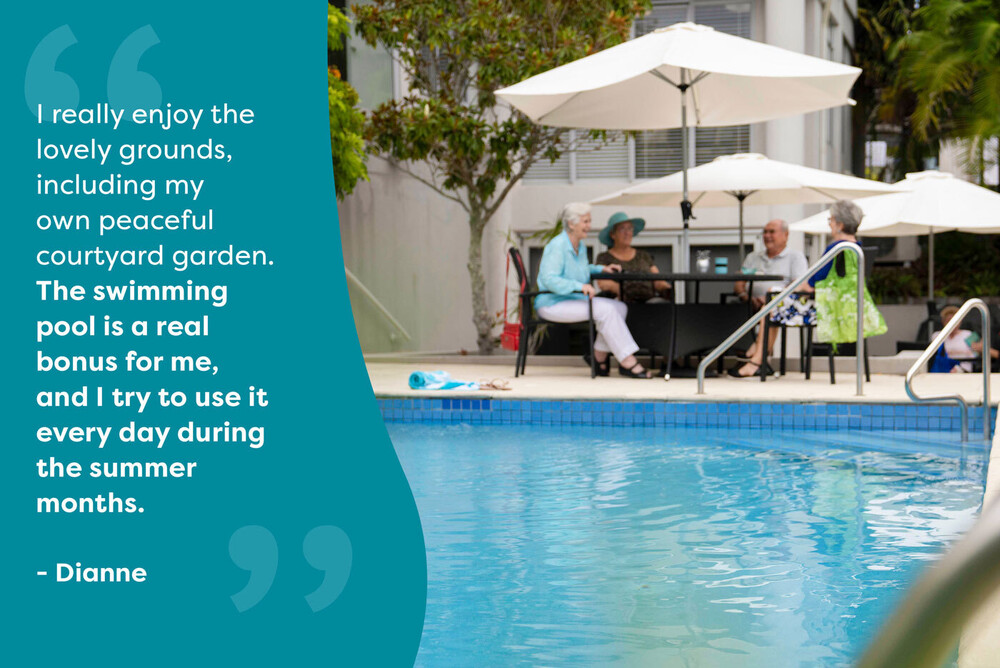 “The grounds and buildings are beautifully cared for, and the pool is a real delight — and often a social centre for barbecues and gatherings. Events are planned for special occasions, and trips out of the village are frequently arranged. Independent living is the keynote here, and it’s clearly respected by all of us as residents.”