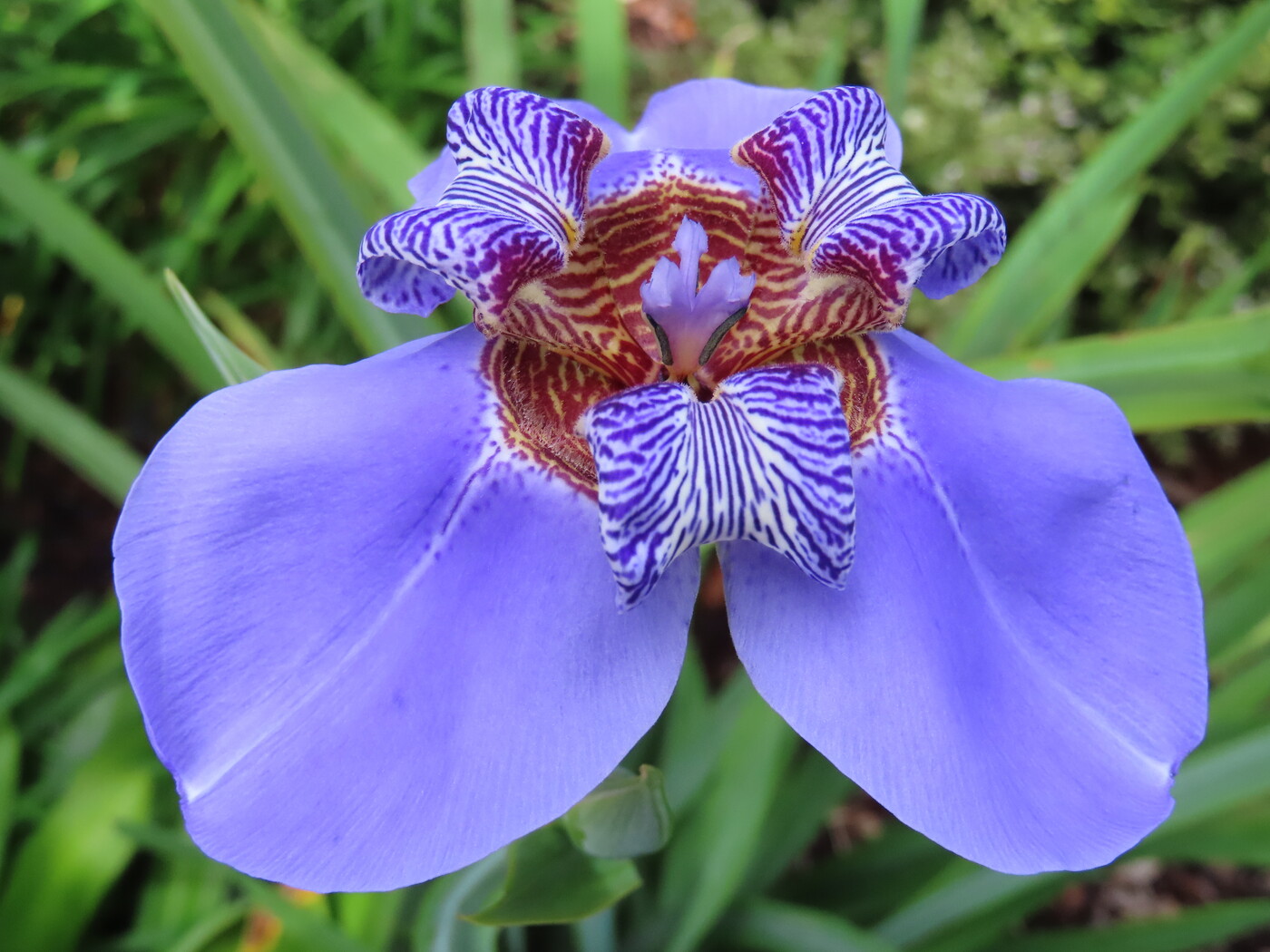 Originating from Brazil, we encounter a native plant species whose captivating blooms take our breath away. The Neomarica caerulea, or Walking Iris, is an unusual member of the Iris family that blooms in spring. It has blue flowers intricately banded in yellow, white, and cinnamon. The blooms occur in waves over several weeks, and they only last one day. Aaron, who is a devoted gardener but also a very skilled photographer, captured a picture of this magnificent bloom last spring.