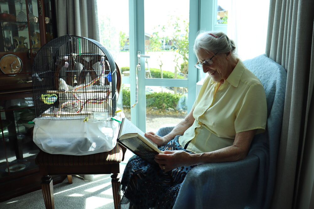 But wild birds aren’t the only ones bringing joy to the village. Some residents have pet birds as well, including Mary, who lives in a serviced apartment with her delightful three-year-old budgie, Tinker. Curious and energetic, Tinker loves perching by the window, watching the sunshine bathe the croquet and bowls green below. Occasionally, Mary lets him out of his cage for a little flight around the apartment, and his favorite activity is perching gently on her fingers.