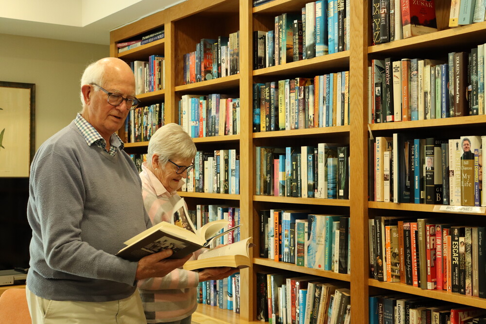 Peter, with his love of books, enjoys spending time in one of his favorite spots—the library at Warkworth Oaks.