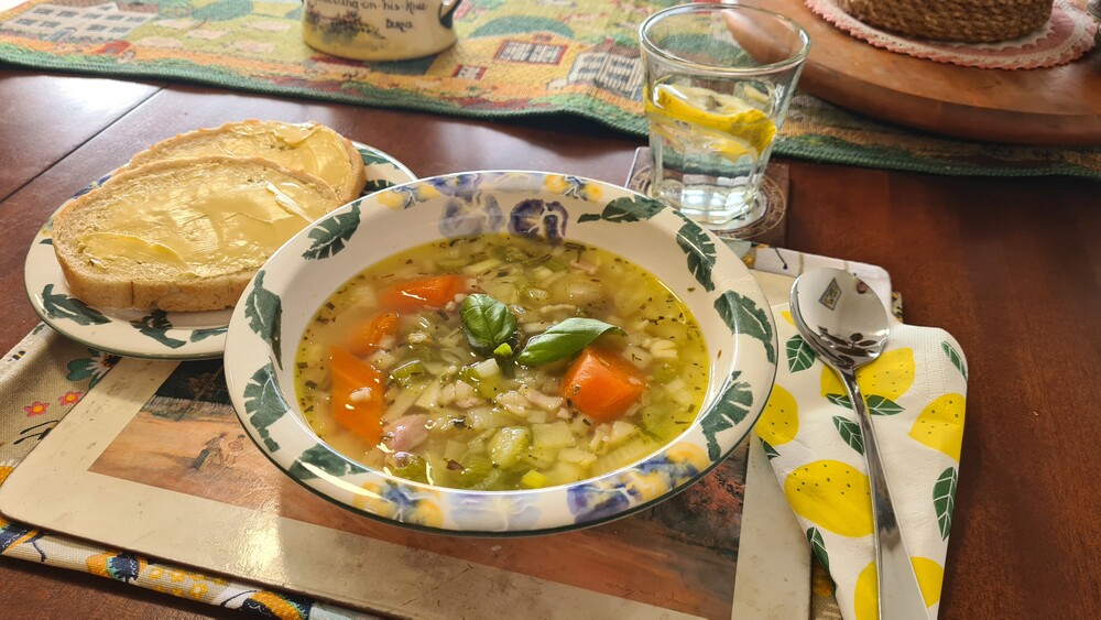 When the vegetables are softened; about 10 mins cooking, add them to the crockpot soup base, with a teaspoon of dried tarragon. Add an extra cup of hot water.