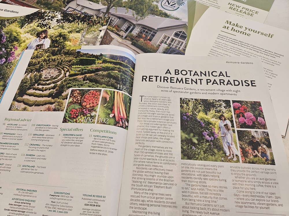 Have you seen us in NZ Gardener this month? Remuera Gardens is featured on page 2 of the latest issue, with a beautifully written article showcasing the eight acres of cottage and tropical gardens that make our village such a special place to live — filled with an eclectic mix of native and exotic species. We think the hydrangeas and flowers in the photos look spectacular — and our residents look just as fabulous!