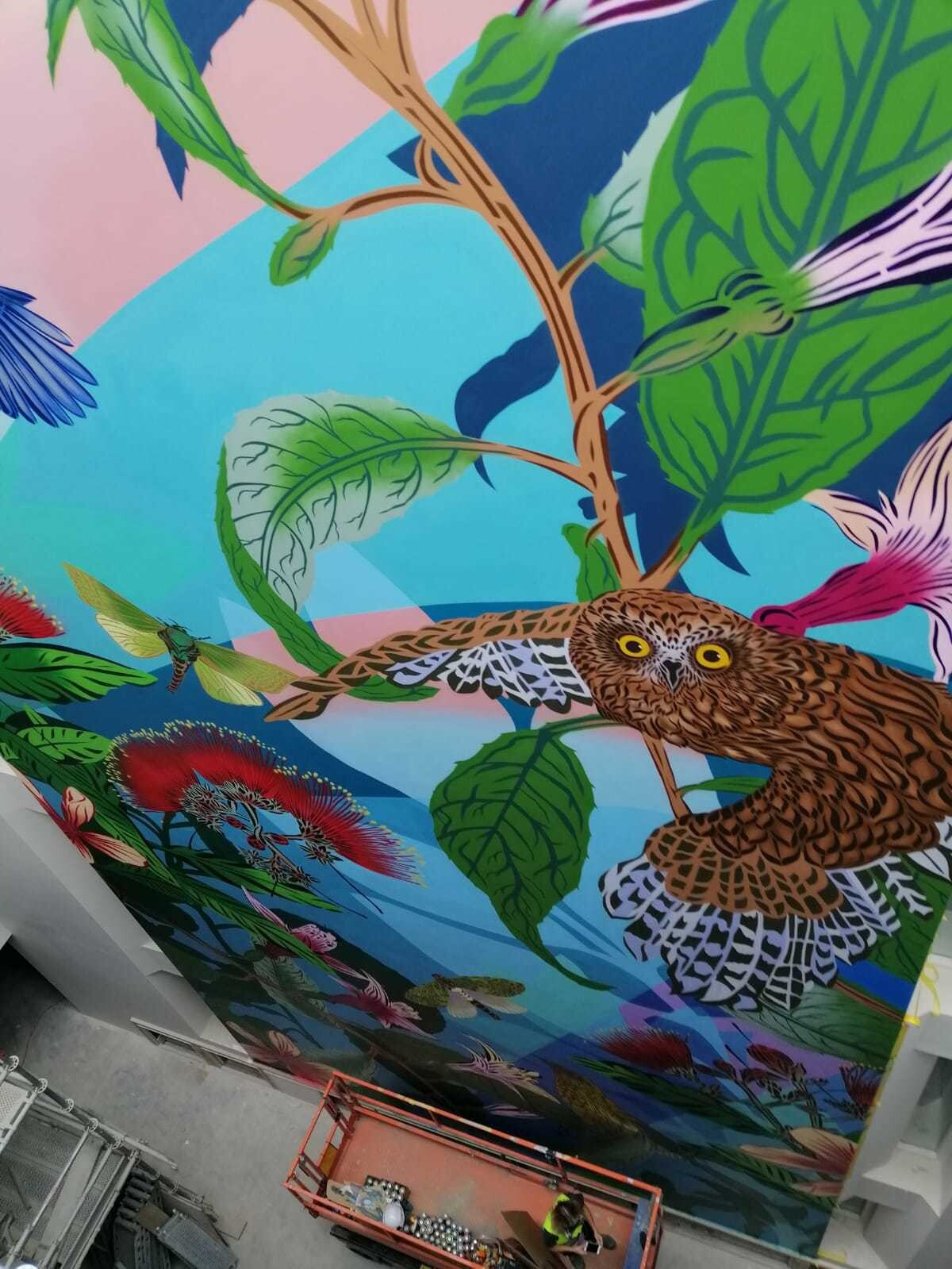 Flox collaborated with artist Ross Liew (TrustMe) taping, spraying and hand painting in the various colours and details. Within quite a tight timeframe, the Pōhutukawa and Kotukutuku bloomed and the Ruru and Tui took flight on the biggest interior mural they’ve created.