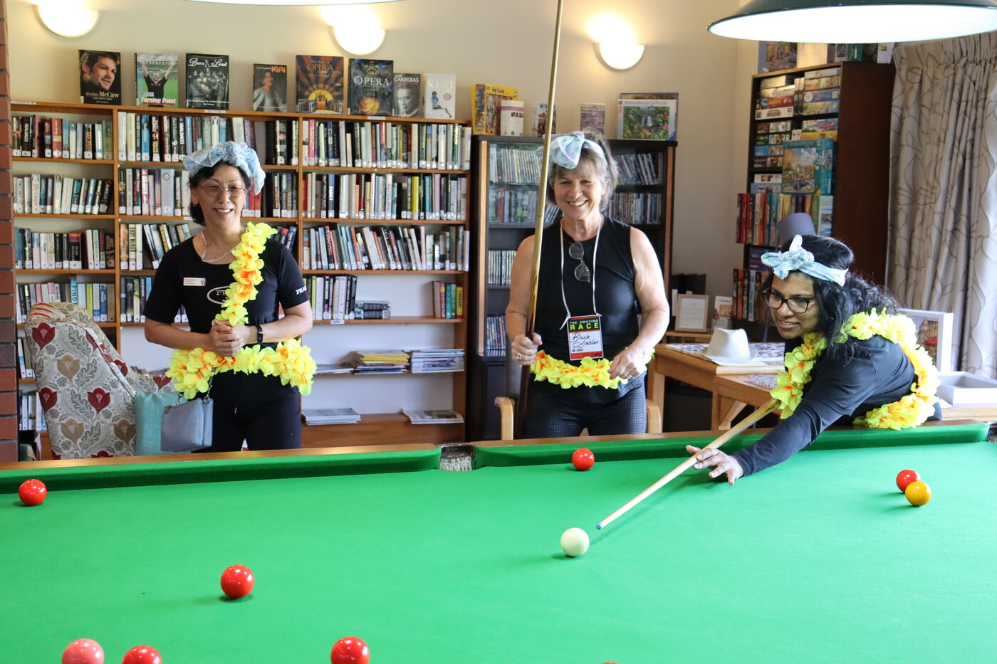 The Village Activities Coordinator, Kirsten, designed the teams mixing staff members that don’t normally work together. Three of the challenges were around the village and the other four were inside, starting with an exhilarating game of snooker where the players had to pot as many balls as possible in under 20 minutes. Pakuranga Park’s Village Manager, Christian Pulley, had a great deal of fun with this exercise and he was very good at helping the colleagues who didn’t have much experience with this game.