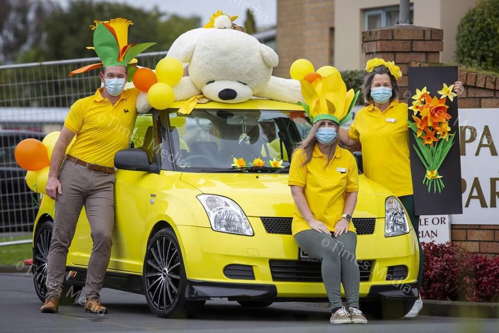 Daffodil Day had to be cancelled because of the lockdown, but our villages found their own way to fundraise for the Cancer Society. Today Pakuranga Park Village Manager Christian Pulley drove around the village with this stunning outfit, selling raffle tickets for an array of yellow themed goods -of course always social distancing from the residents. Their initiative caught the attention of local newspaper Times Online which took this wonderful picture of Christian with the village's Activities Coordinators, Kirsten Bell and Chris Bull.
