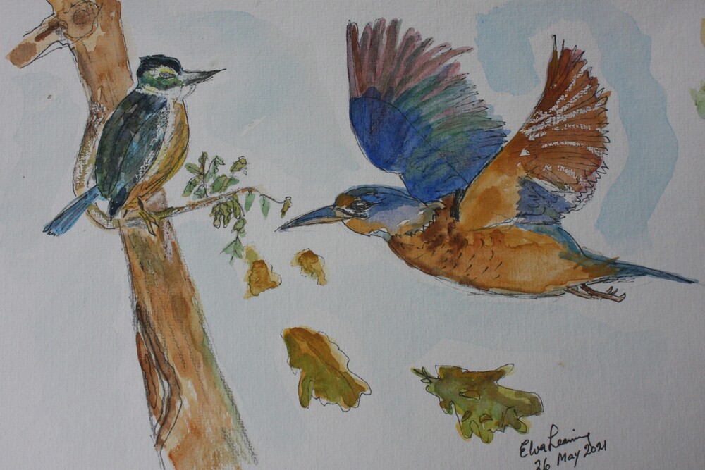 As an amateur painter, Elva enjoys seeing how the seasons transform the trees, with spring showing the most dramatic change. Many birds choose the oaks in front of her apartment to build their nests. Last month she drew this gorgeous sketch of a kingfisher who spent the day in front of her favourite window.