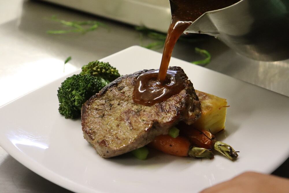 The Huntsman dinner always offers a wide range of culinary options to satisfy the diverse palates of our residents. For example, diners can choose as an entrée between “Chicken pate with chutney, gherkin and toast” or “Baby beetroot salad with goat cheese, walnut and arugula with balsamic dressing”. The main meal always provides a choice between meat dishes and tantalizing fish creations, with residents having the option of “Scotch fillet with potato gratin, honey glazed baby carrot and broccoli with mustard gravy” or “Baked fish of the day with potato gratin, honey glazed carrot and broccoli with caper sauce”.