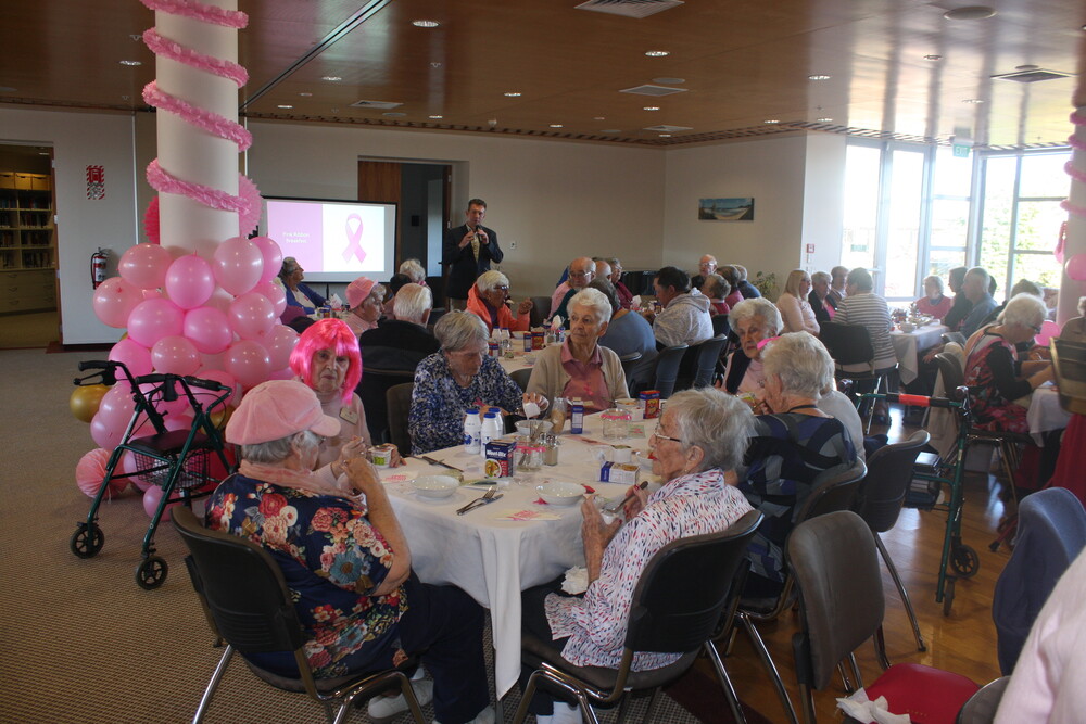 Pakuranga Park hosted a very successful Pink Ribbon Breakfast on Thursday to raise funds for the Breast Cancer Foundation NZ. About 80 residents participated in the event. They all enjoyed a delicious breakfast prepared by Bradley and his team at the village café. Main meal was Eggs Benedict on salmon or bacon, with a vegetarian option of mushrooms.